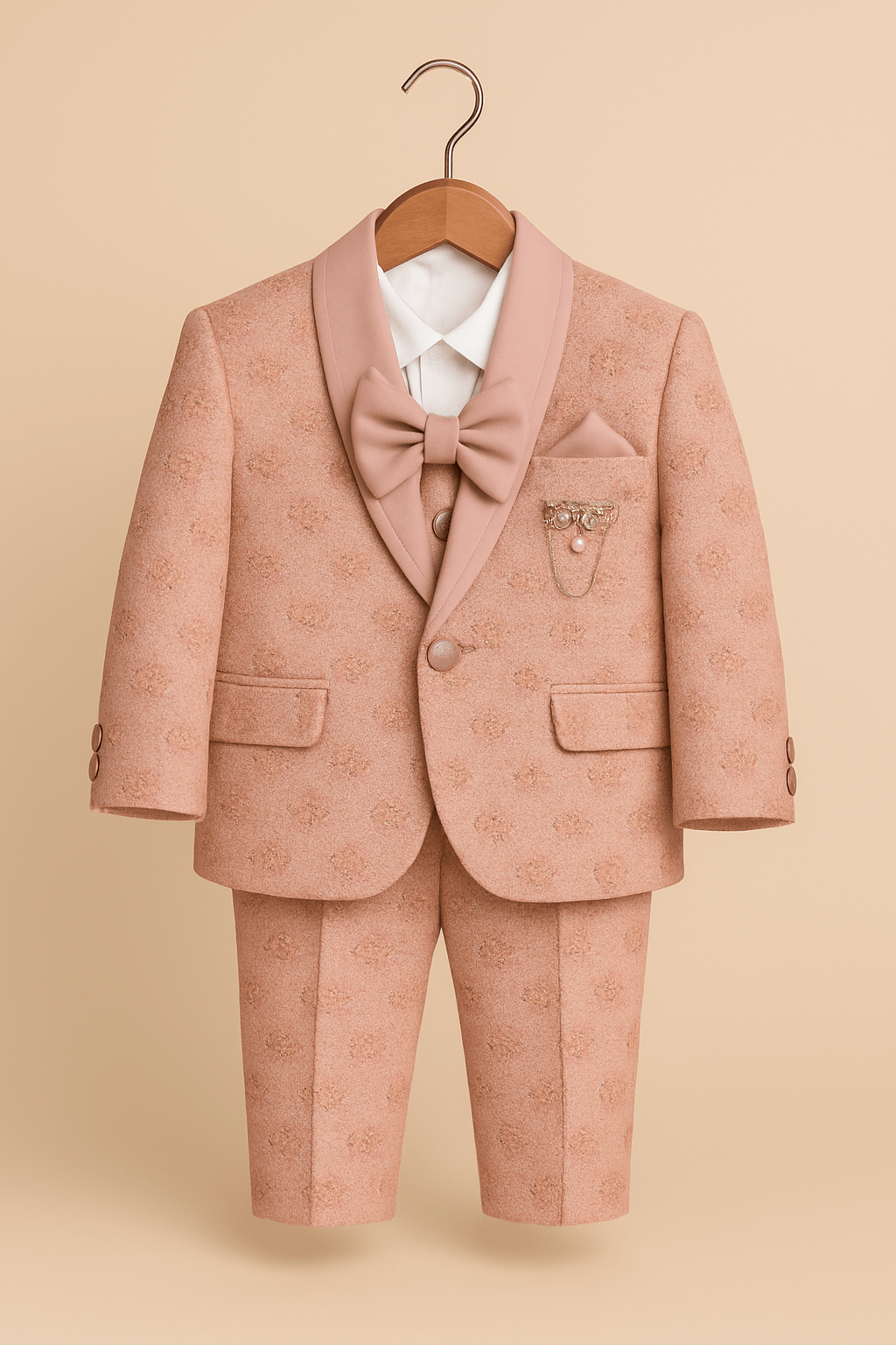 The carefully tailored jacket, paired with perfectly fitted trousers and a coordinating bow tie, creates a sharp, modern silhouette that is both stylish and timeless. The decorative pocket chain adds an elegant finishing touch, making it ideal for formal events where you want your child to feel as special as the occasion.